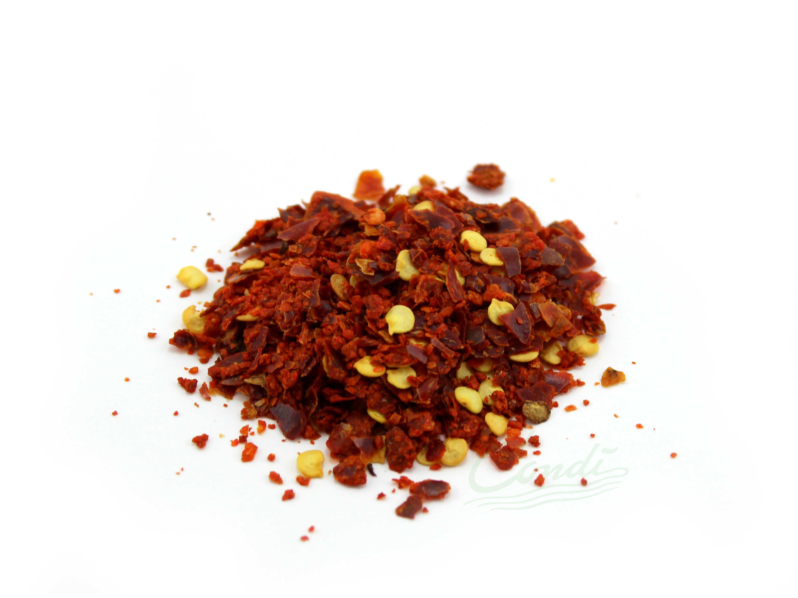 Knust chili fremtræder som et rødbrunt granulat iblandet kerner.