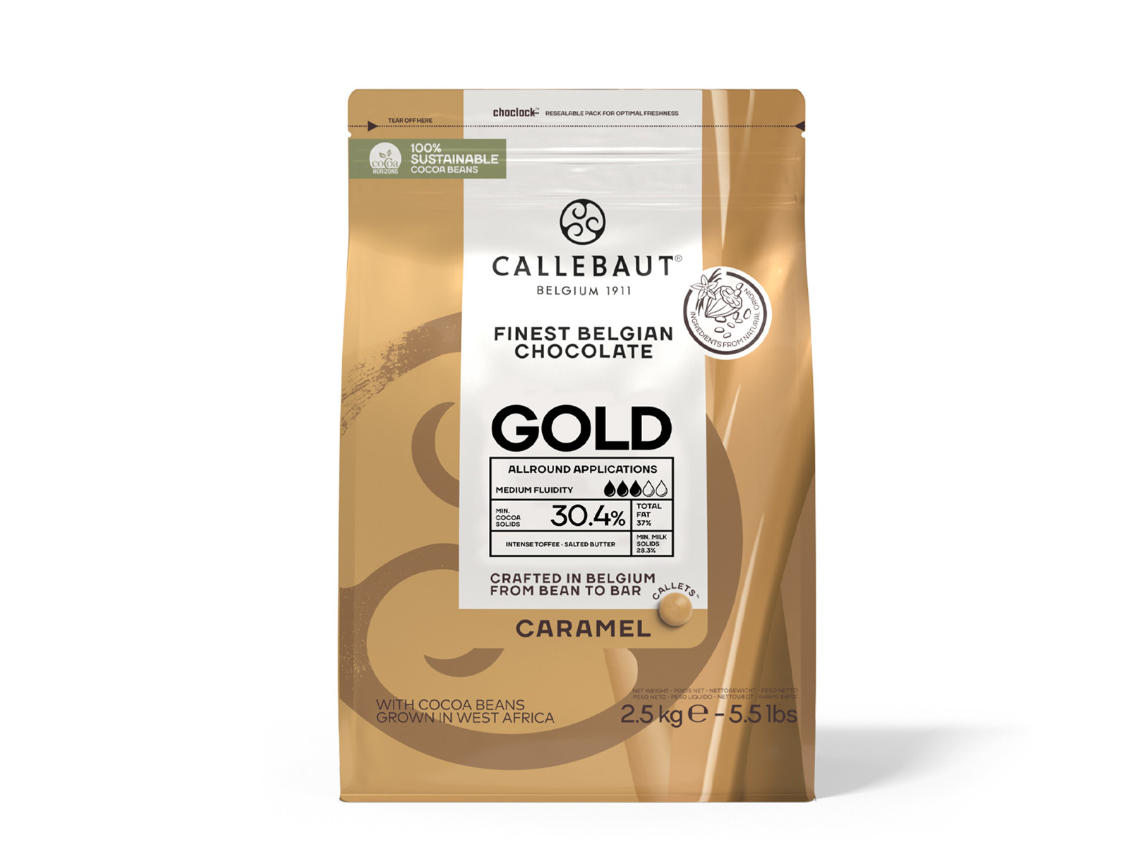 GOLD er hvid chokolade karamel knapper, der er sammensat af et fint udvalg af ingredienser som karamelliseret sukker og karamelliseret mælk.
