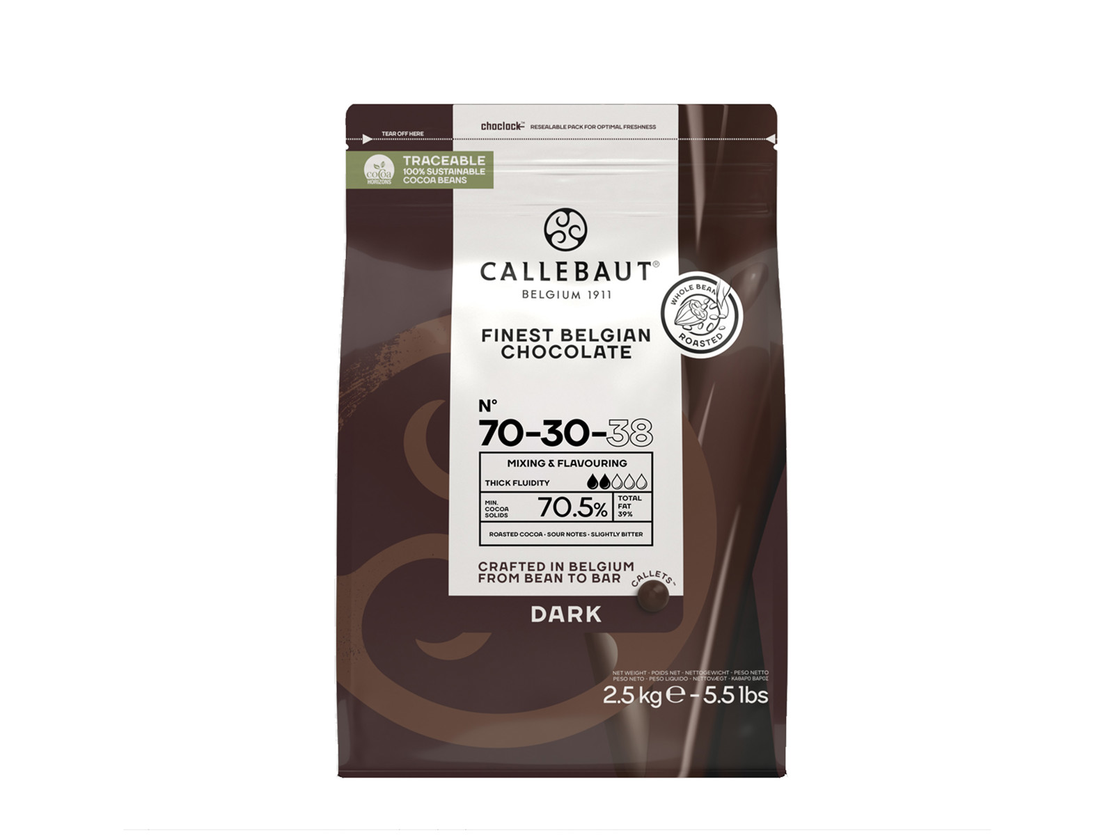 Callebauts 70-30 vil overraske dig med en meget tynd chokolade skal, smuk glans, god smag og dyb farve.