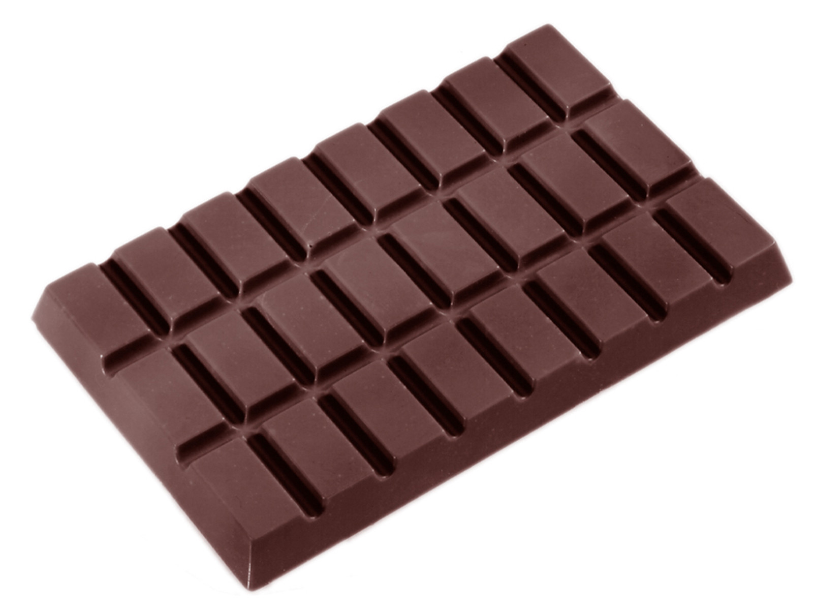 Størrelsen på chokoladestykket er 124x77x20 mm. Vægt +/- 205 g. Formen indeholder 1x3 plader