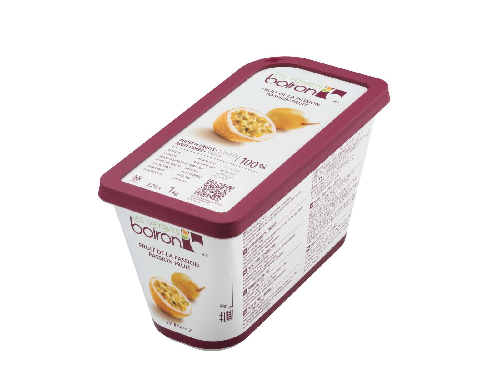 Frugtpuréen fra Boiron er lavet af 100% passionfrugt og er ikke tilsat sukker. Den har en tæt, gul farve og passionsfrugtens aromatiske sødme.