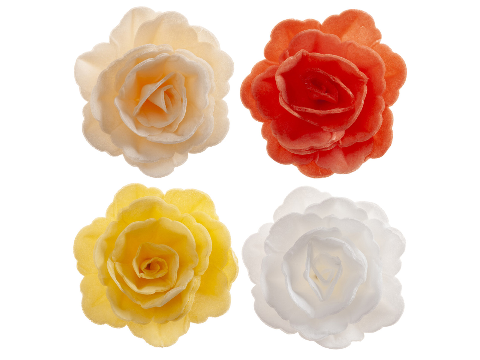 Flotte assorterede roser i spiseligt vaffelpapir.