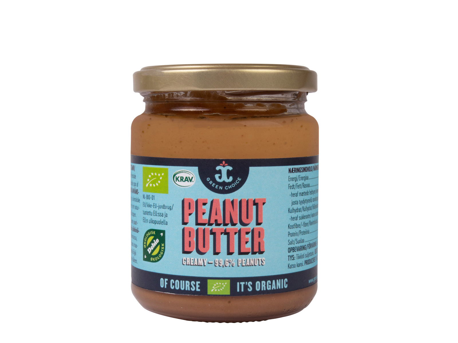 Består af 99% peanuts. Det rene produkt kan danne en olie på toppen der lige skal røres inden det bruges.