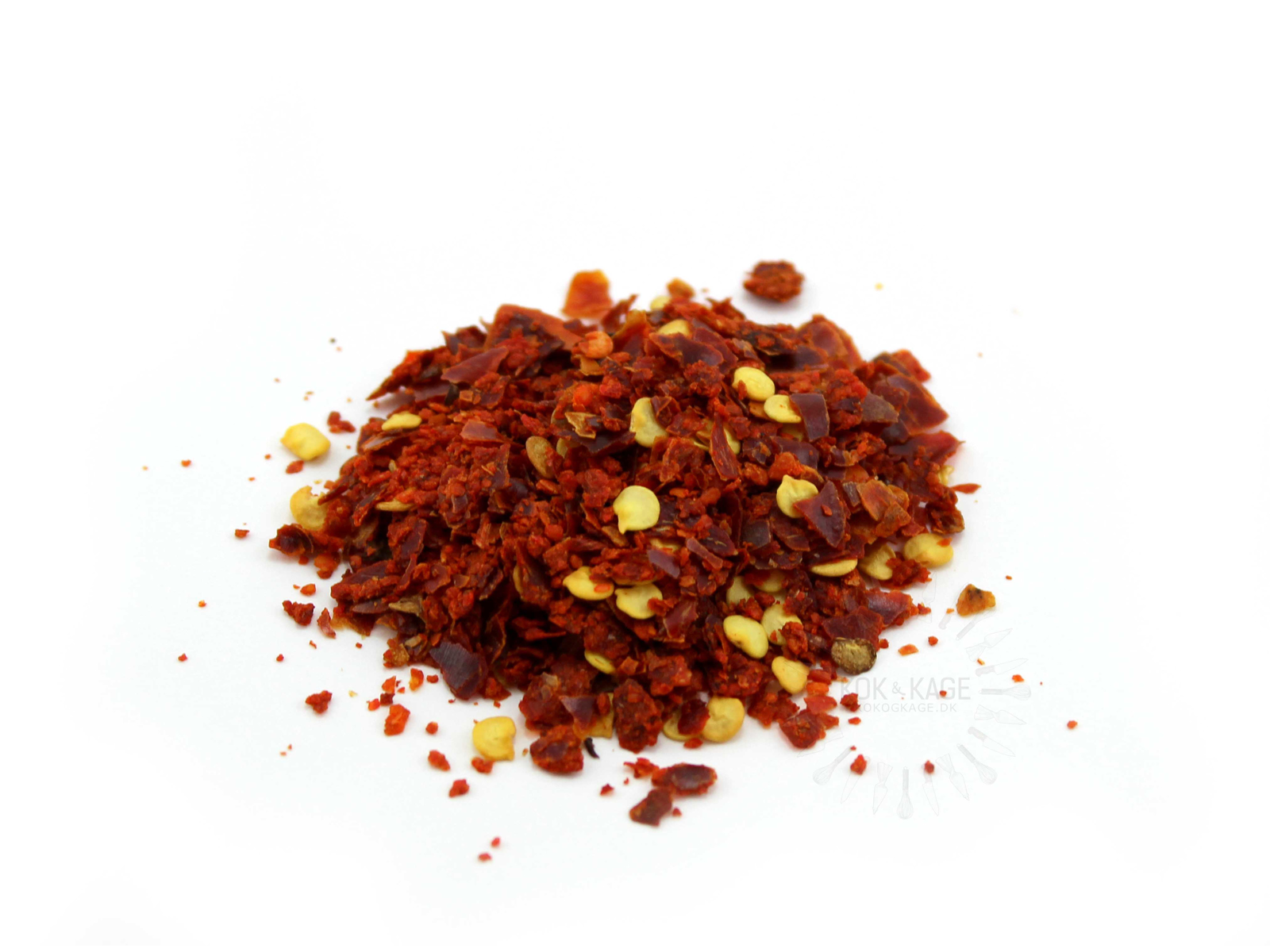 Den knuste chili fremstår som en rødbrunt granulat med kerne blandet i.