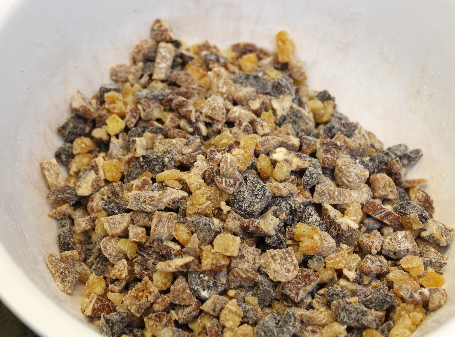 Vend chokolademassen i æggemassen med en dejspartel. Sigt de tørre ingredienser i massen og vend det sammen med et piskeris. Tilsæt vaniljemarv, flagesalt og knust kardemommefrø. Herefter vendes nødder og tørret frugt med mel og frugter og nødder vendes i massen. Melet gør at frugt og nødder ikke falder til bunds i kagen, når den bages.