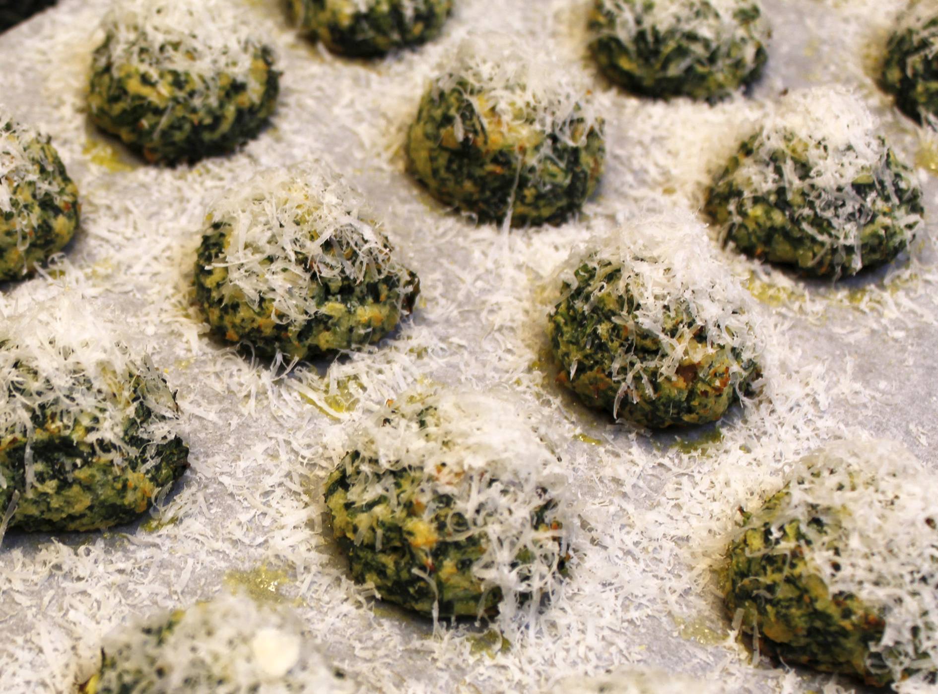 Herefter formes runde bolde i hånden ca. som en golfbold, stil dem på en plade med bagepapir på, så der er afstand mellem dem. Kom lidt olivenolie over. Og bag dem nu en 15 min i ovnen så de får farve.