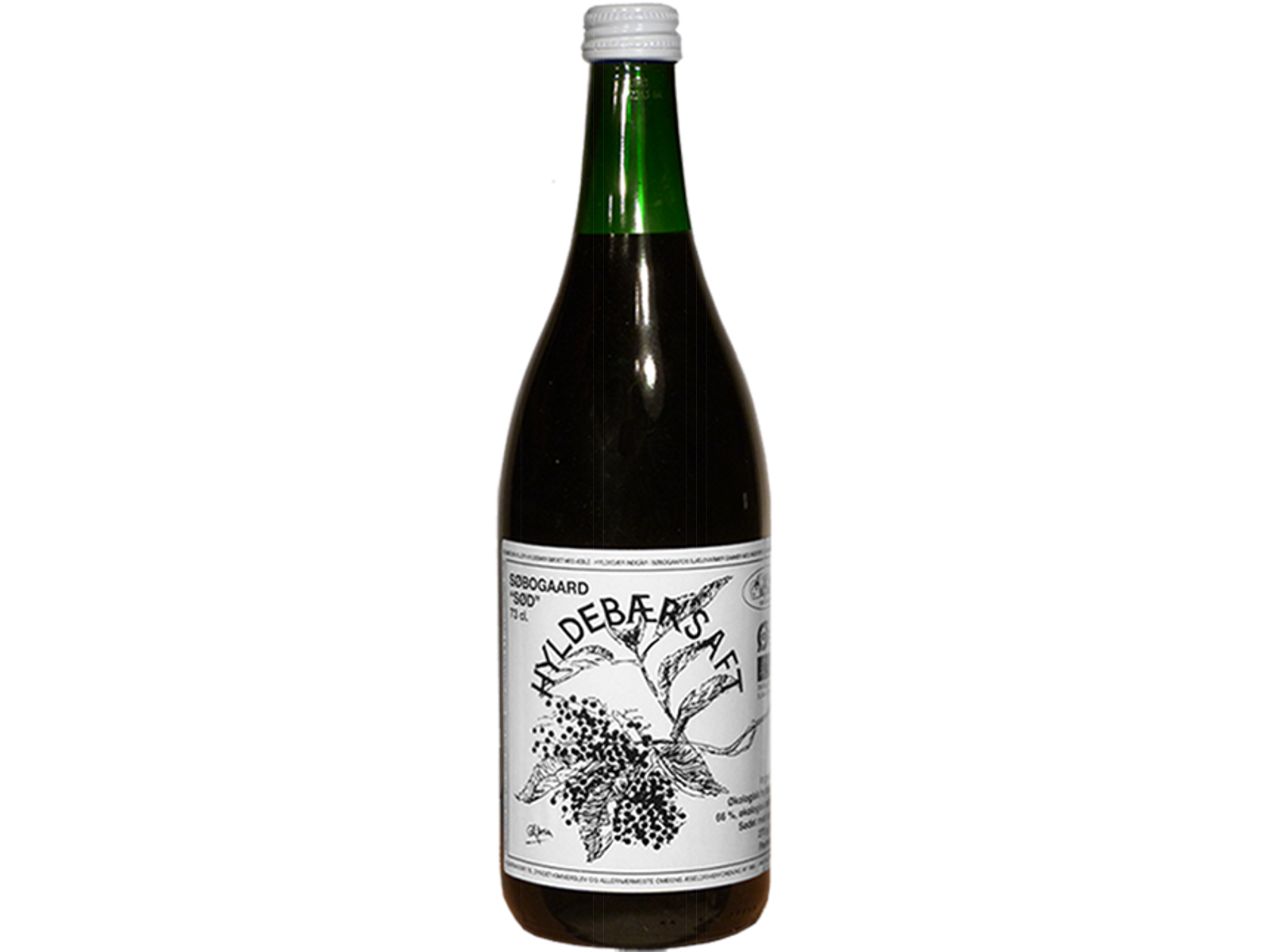 Forfriskende hyldebærsaft fra Søbogaard lavet på fuldmodne økologiske hyldebær og 10% Søbogaard æblemost