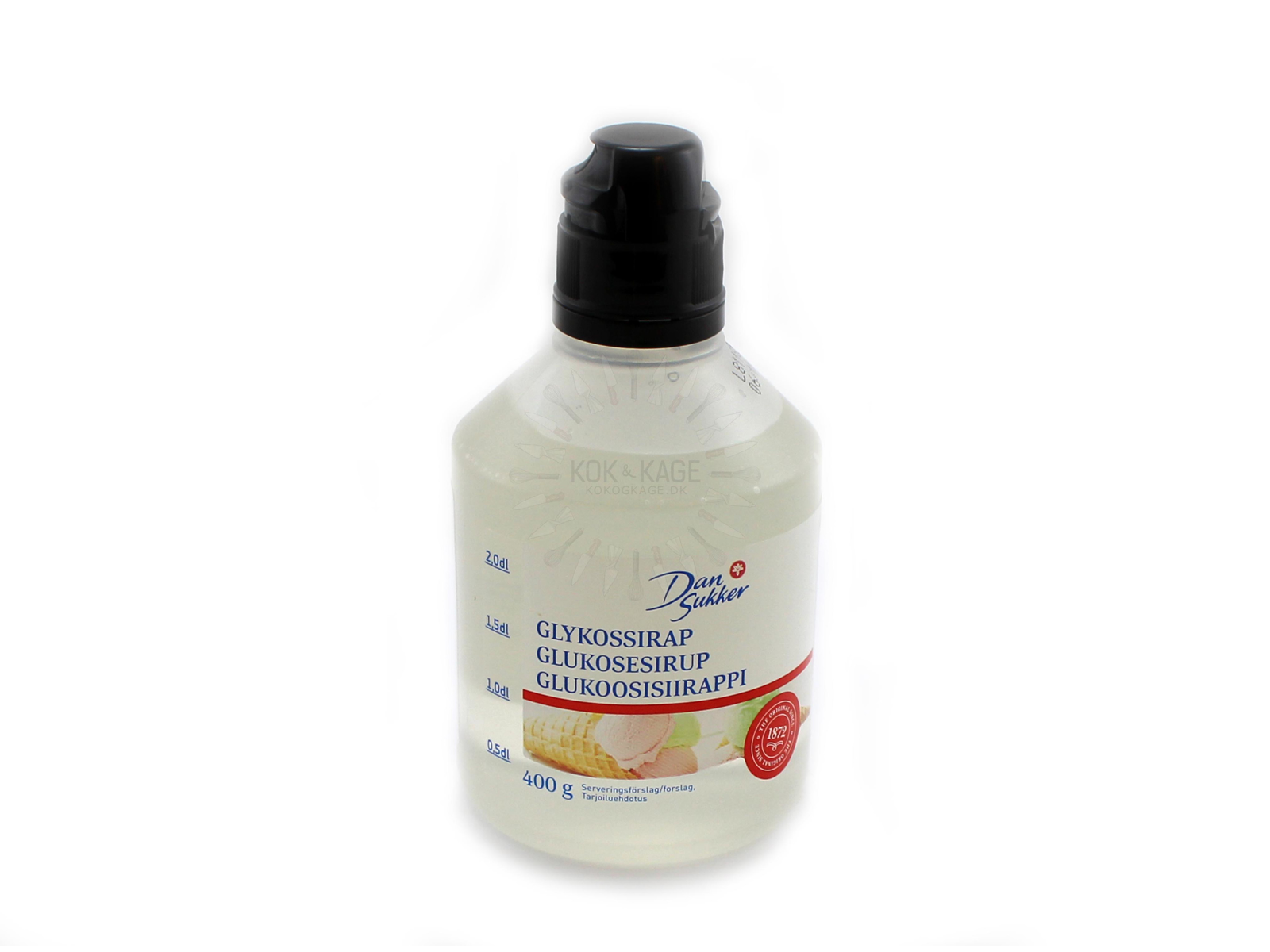 Glukosesirup i en lille praktiske flaske med 400 g der nemt kan lukkes igen.
